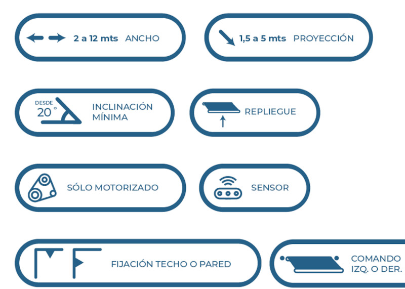 Con una estructura fija de fácil montaje, presenta columnas frontales de sostén y guías equipadas con amortiguadores a gas que tensan de forma uniforme el tejido y ojales para la evacuación del agua de la lluvia.