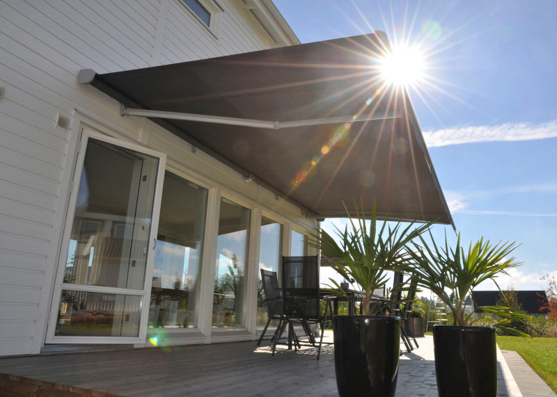 En la posición de 90° se alcanza el mayor avance. Al continuar el accionamiento, el toldo prosigue su movimiento hasta alcanzar los 180º, su máxima proyección quedando casi en posición vertical.